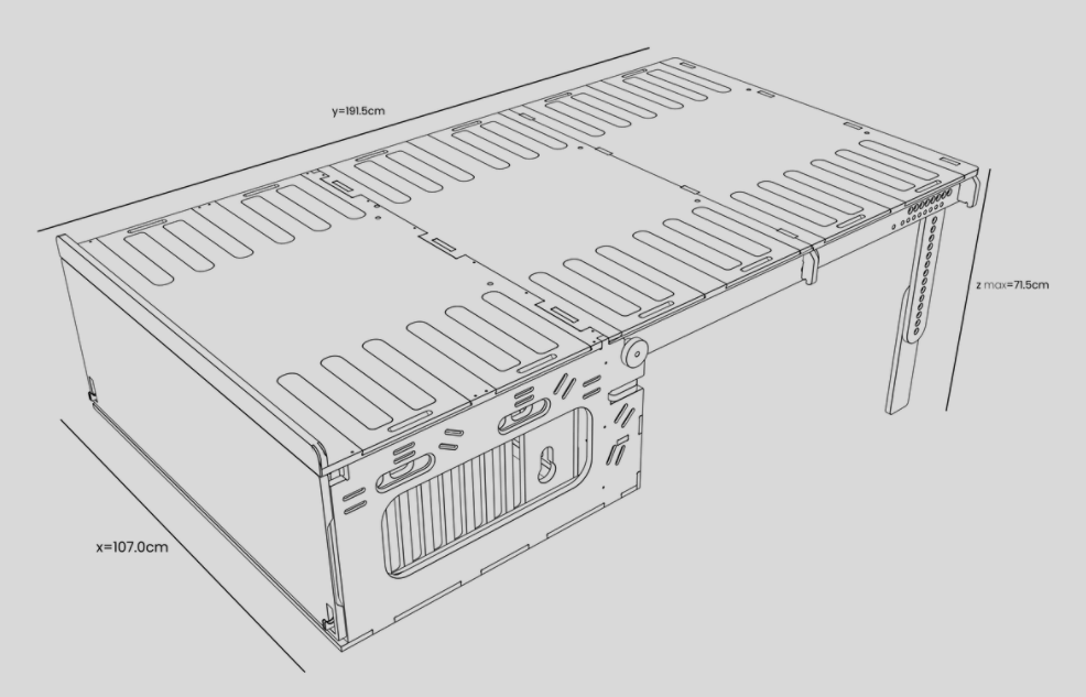 K vytvoření stolu, stačí s pomocí další osoby vyjmout zásuvku, sklopit nožičky, které jsou součástí, a použít tak stůl kdekoliv chcete
