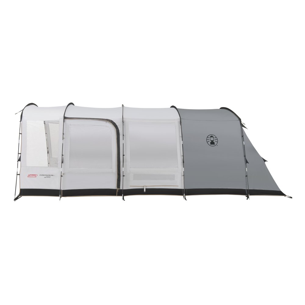 Ideální partner pro Váš obytný vůz.Ať jedete kamkoliv, řada přístřešků Coleman Journey Master Pro Vám poskytne další obytný a spací prostor. Tunelový kador pásek umožňuje odjet s vozem, zatímco markýza zůstane postavena. Prostorná ložnice poskytuje klidné místo pro spaní až pro 4 osoby.Bezbariérový přístup, Storm popruhy, Výškově nastavitelný popruh pro tunel, Předokenní rolety na zip, Dva stupně ventilace, Úložné kapsy, Vstupní porty pro kabely.