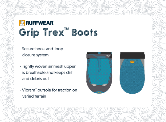 Boty pro psy Grip Trex představují standard v oblasti nošení tlapek pro psy, kteří se svými lidmi chodí na túry, jezdí na kole, běhají nebo prozkoumávají přírodu. Tyto vysoce výkonné boty mají robustní a odolnou podrážku Vibram navrženou společností Ruffwear, která poskytuje výjimečnou trakci v rozmanitém terénu. Prodyšný svršek ze síťoviny zajišťuje větrání a zabraňuje pronikání nečistot a úlomků. Systém zapínání kombinuje háčky a smyčky s kováním, které se zapínají kolem nejužší části psí nohy a zajišťují bezpečné uchycení.