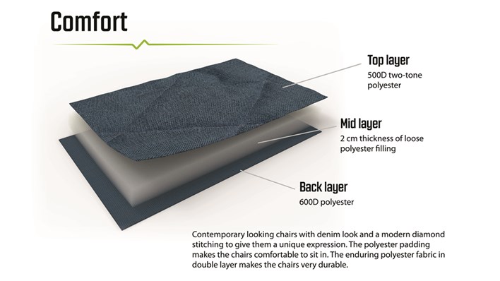 Celočalouněný dvoubarevný polyester poskytuje dokonalé pohodlí při stolování i odpočinku a je podepřen odolným, vysoce pevným ocelovým rámem s práškovým nástřikem a funkcí zámku. Mezi vlastnosti patří široké nohy pro stabilitu a malé rozměry v balení s přiloženým přepravním vakem.