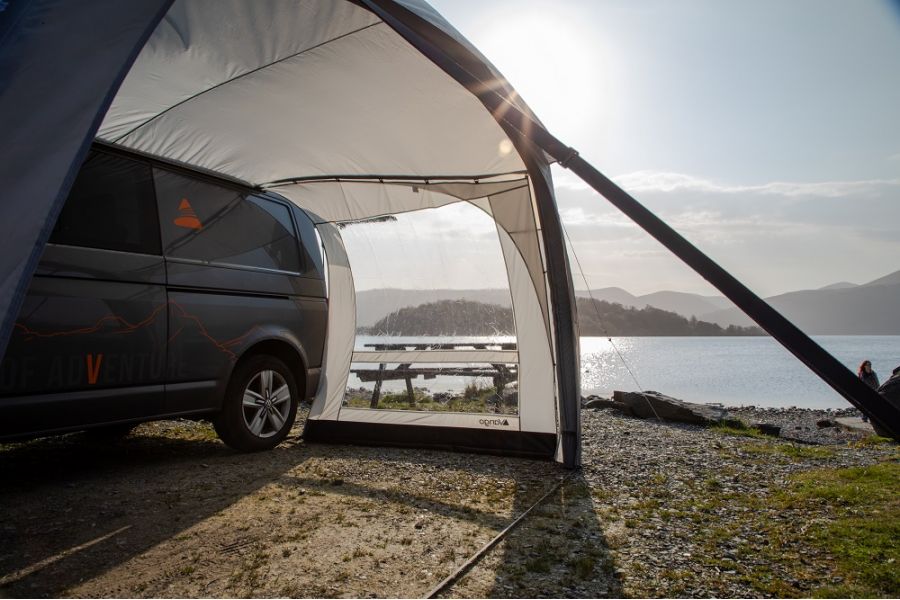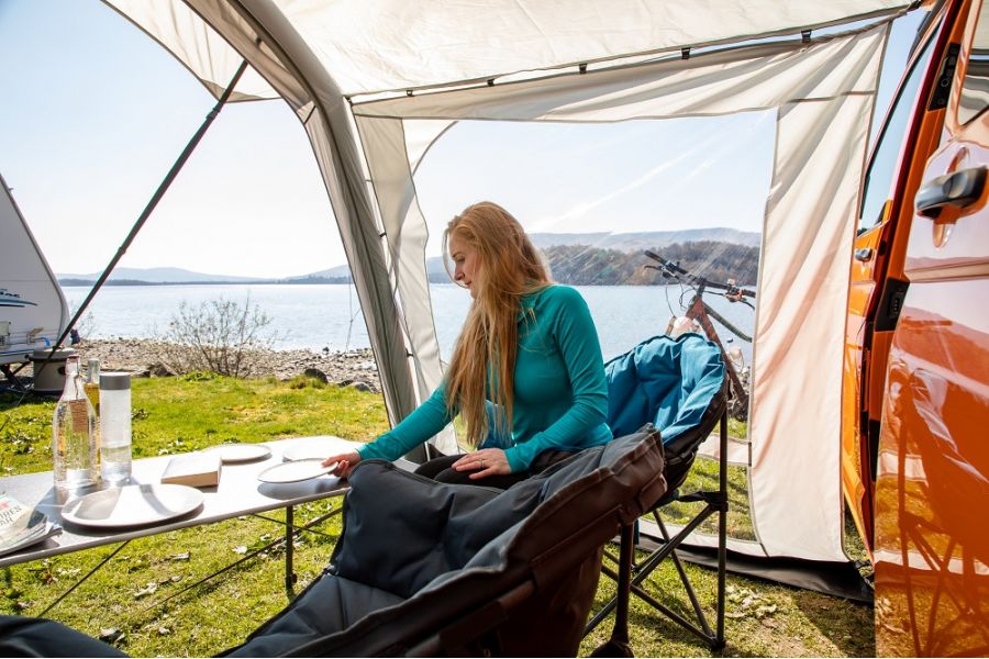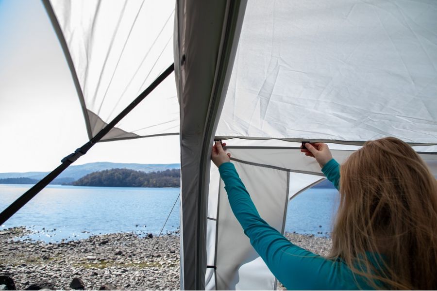 Boční zdi AirBeam Sky Canopy pomohou vytvořit uzavřený obytný prostor. Instalace je jednoduchá pomocí klipu SkyTrack, který se nasune na bok sluneční plachty pomocí systému SkyTrack II®.